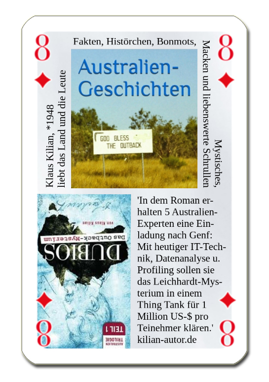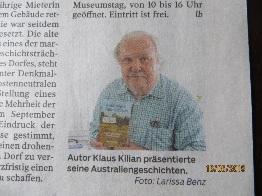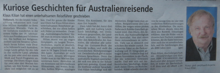 "Das Buch „Australien-Geschichten – Hintergründiges und Kurioses“ des freien Autors Klaus Kilian ist im Mai 2018 erschienen. Es ist sein zweites Buch nach dem Roman „Dubios – Das Outback-Mysterium“. „Australien-Geschichten“ besteht aus 20 Kurzgeschichten, die unter anderem Landschaftliches und Historisches beinhalten ..."