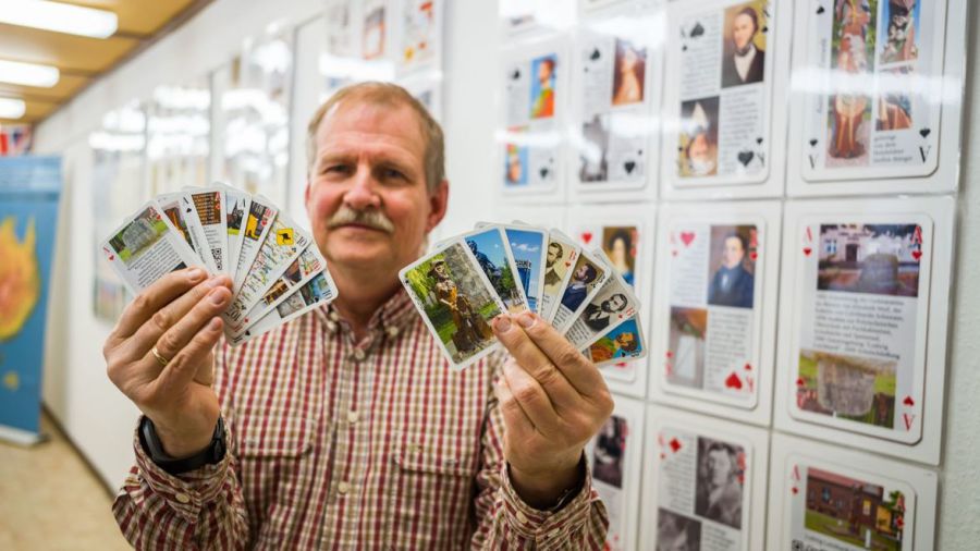 Foto: André Parade präsentiert das Kartenspiel im Leichhardt-Museum in Trebatsch– Foto: Jörn Tornow / MOZ 30. 11. 2020